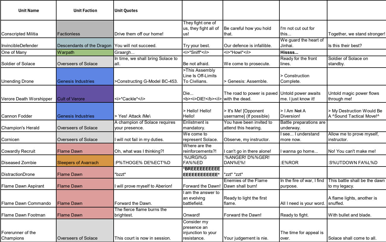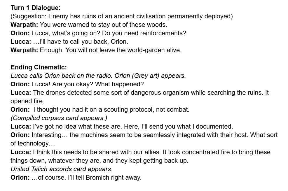 The game's 8 factions were all set to receive their own playable story in different parts of the game's timeline. Working with a team of writers, I helped provide narratives that provided unique perspectives on each of the factions' roles in the story.Each campaign had 3 missions and a boss fight, which all required dialogue for the opening cinematic, closing cinematic, and first turn of gameplay.