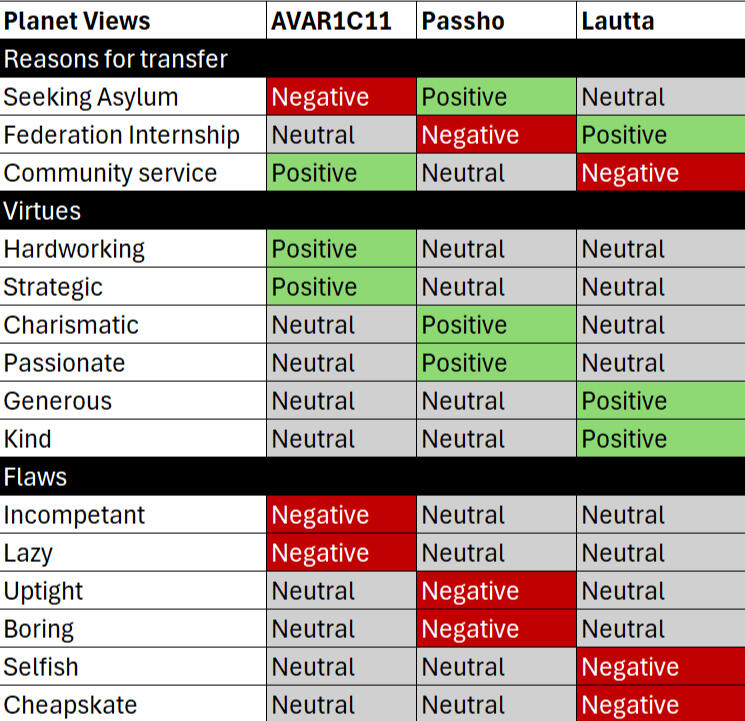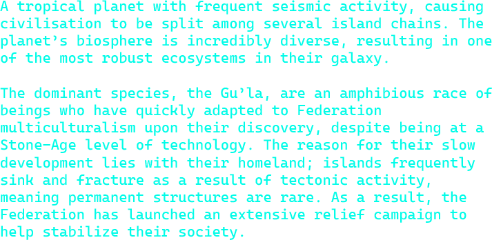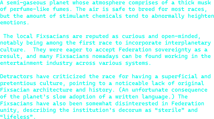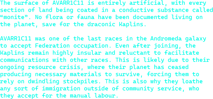 Based off the sin of greed, this planet favours any traits that would result in earning money.Thier planet suffers from a shortage in natural resources in order to justify their participation in the federation, as well as their preference for community service.