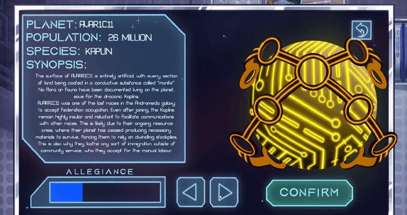 The seven alien races in the Andromeda system were set to be themed around the seven deadly sins, but also needed to feel like they were in a feasible, functioning society.Furthermore, Spaceport 925's gameplay loop involved sending aliens to a planet of the player's choice, and the amount of allegiance earned or lost depended on how favorably these planets viewed the traits of their new inhabitants.Therefore, the planets' cultures and histories needed to justify the scores they provided to these traits.