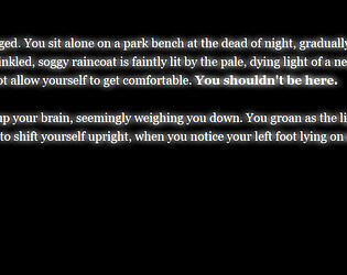 A text-based Twine Survival/Psychological Horror where players must choose carefully to escape a park full of monsters. This project has helped me delve outside the visual narratives I'm used to writing, by making me tell an interactive story entirely through words.